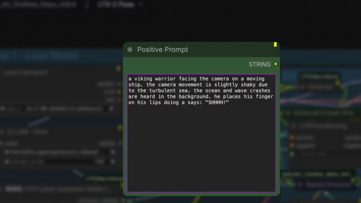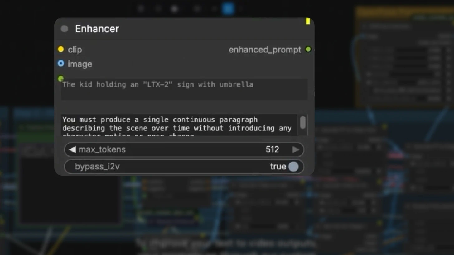 In text-to-video mode, prompts pass through the custom prompt enhancer node, which includes an elaborate system prompt for refinement.